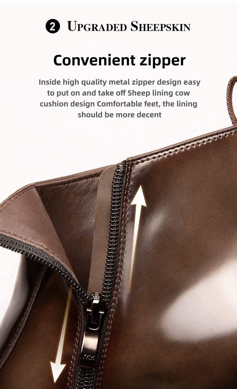 The upper is crafted from premium cowhide leather featuring a high-gloss finish, offering a clean, elegant appearance with excellent durability. The smooth leather surface enhances versatility, making the boots easy to pair with casual trousers, jeans, or smart-casual outfits. A round-toe design ensures natural comfort and relaxed foot movement throughout the day.