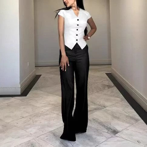 ✅ Flattering Silhouette — V-neck top elongates the neckline + high-waisted straight-leg pants streamline curves.