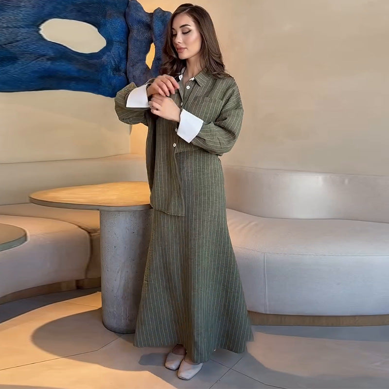 This chic shirt and skirt set combines modern sophistication, a flattering fit, and versatile styling—an essential piece for the stylish woman’s wardrobe. Featuring clean vertical stripes, a high-waisted skirt, and a matching belt, it delivers both effortless beauty and practical comfort.